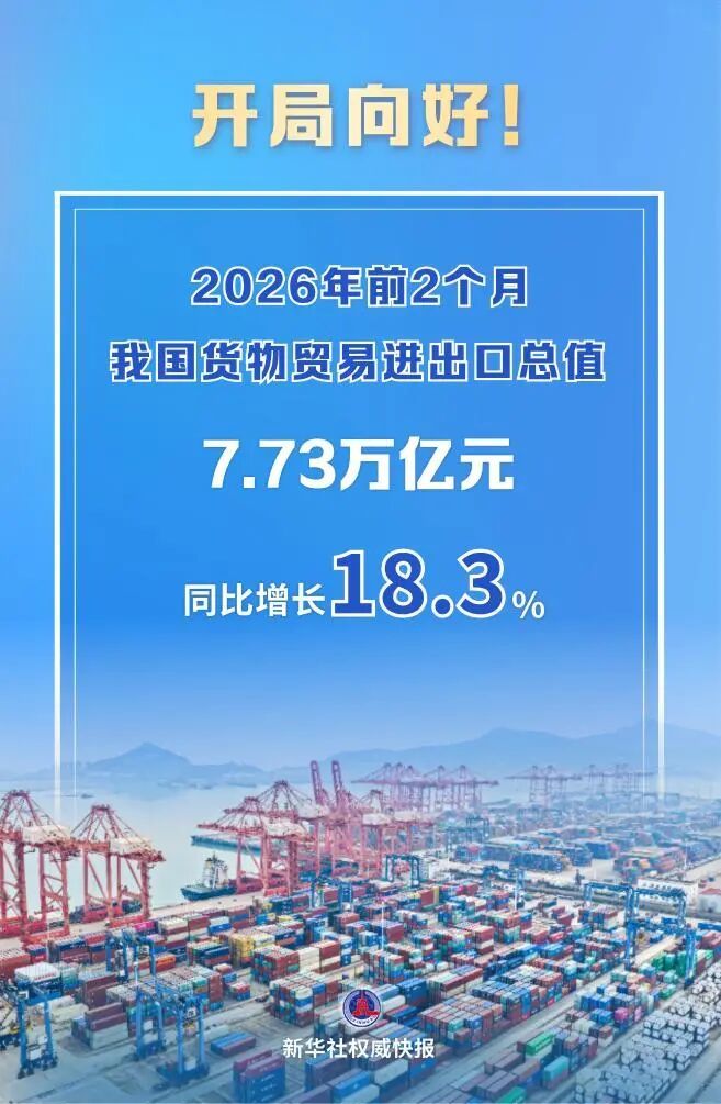 海关总署3月10日发布数据显示,2026年前2个月,我国货物贸易进出口总值7.73万亿元,同比增速重回两位数至18.3%。