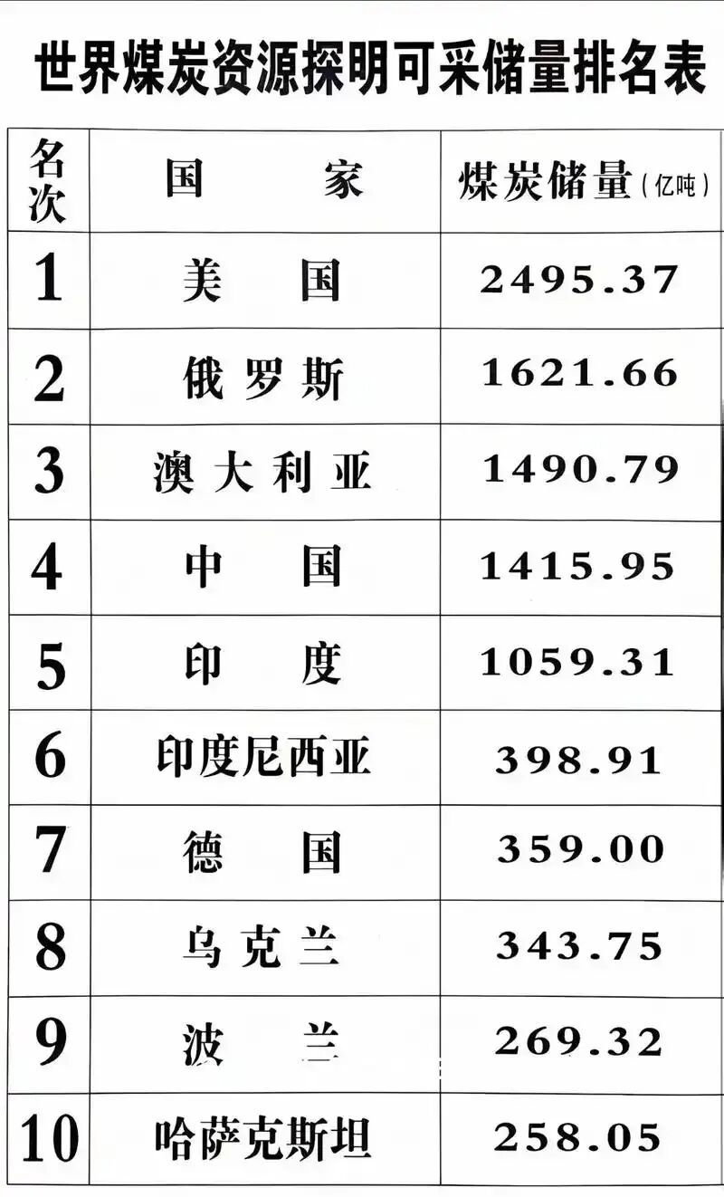 《世界统计年鉴》给出的全球煤炭资源探明可采储量排名